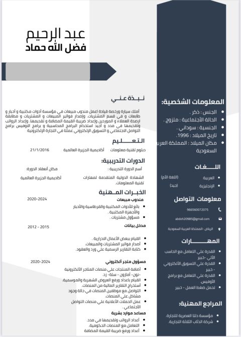 مقيم في الرياض إقامة ورخصة سارية اشتغلت بالمبيعات بالاعلانات مندوب ثم مشرف مبيعات واشتغلت بمبيعات مشاريع الأمن والسلامة وعلي دراية في الرياض وأستطيع العمل بأي مجال بالمبيعات أتحمل ضغط العمل والعمل بروح الفريق لتحقيق الأهداف المطلوبه. المؤهل العلمي حاصل على ليسانس الحقوق