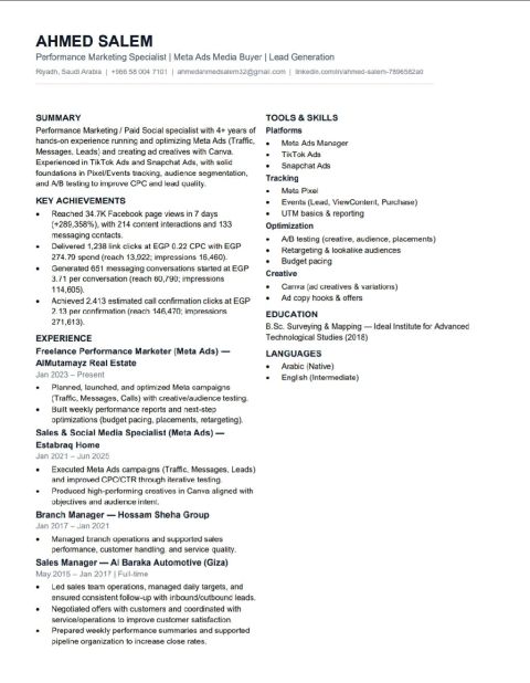 خبرة في اعلانات السوشيال ميديا 5 سنوات + خبرة في إدارة الفروع والموظفين وتحسين جودة العمل + خبرة في المبيعات المباشرة متواجد في الرياض وجاهز للانتقال الى أي منطقة