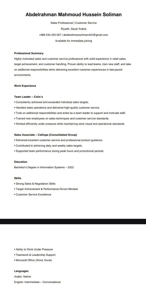 الاسم كريم مصطفى السن 23 سنة خريج بكالوريوس محاسبه رخصة سواقة سعوديه والآن اعمل بمجال المبيعات وعندي القدرة علي رفع مستوى المبيعات واكتساب العملاء والتفاوض معهم وأتحمل ضغط العمل لأطول فترة ممكنه وعندي خبرة قوية في الكمبيوتر واعمل علي برنامج الأكسيل والورد وأسماك والمتفوق واعمل بالمملكة منذ سنتان وابحث عن فرصه للانضمام لفريق عمل احترافي يقدر الكفاءة ويوفر بيئة تدعم التطور الوظيفي