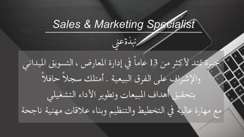 أخصائي تسويق ومبيعات يتمتع بخبرة تمتد لأكثر من 13 عاما في إدارة المعارض، التسويق الميداني، والاشراف على الفرق البيعية. امتلك سجلا حافلا بتحقيق أهداف المبيعات وتطوير الأداء التشغيلي، مع مهارة عالية في التخطيط والتنظيم وبناء علاقات مهنية ناجحة