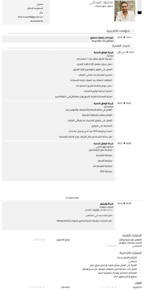مندوب مبيعات مودرن تريد 29 عام خبرة 6 سنوات في السوق السعودي المنطقة الشرقية وعملت في شركة يونيليفر مصر. رقم التواصل