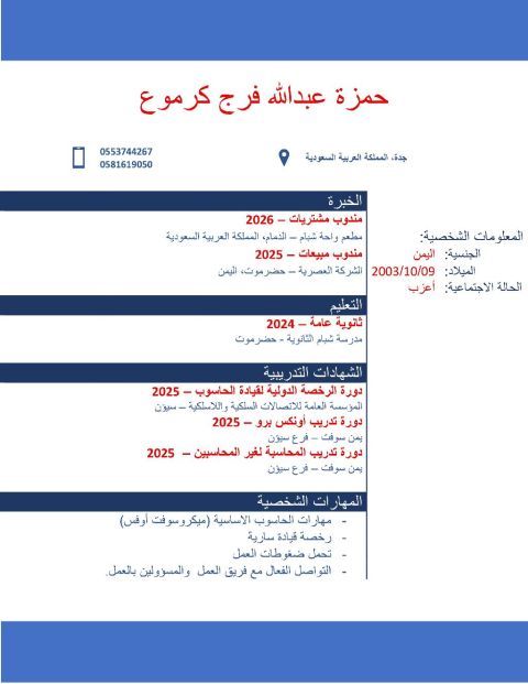 الاسم حمزة عبد المجيد أحمد سعيد العمر 23 سنة الجنسية يمني المؤهل الدراسي ثانوية عامة + دبلوم في نظام الرخصة الدولية لقيادة الحاسب الآلي + سنتين في مجال المحاسبة المالية في كلية التجارة جامعة عمران عملت لدى مكتبة قرطاسية + مندوب مبيعات مياه في المدينة المنورة + أمين مستودع + كاشير في محل مياه + كاشير في محلات تجارية للتواصل