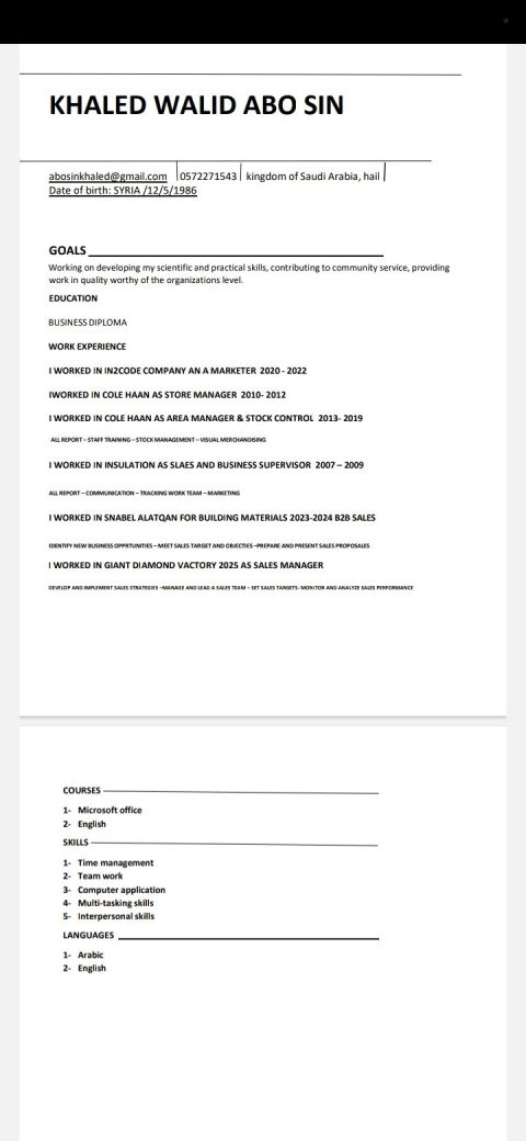 خالد أبو سن من سوريا مواليد 1986 الخبرات مدير مبيعات ومحاسب ومدير مشتريات بالاضافة للخبرة في المقاولات لدي خبرة في إدارة المعارض والتسويق والمبيعات، امتلك مهارات قوية في إدارة الوقت والعمل تحت الضغط والابتكار وحل المشكلات. كما انني امتلك خبرة في استخدام برامج مايكروسوفت أوفيس ابحث عن عمل مطلوب عمل دوام مسائي في حائل