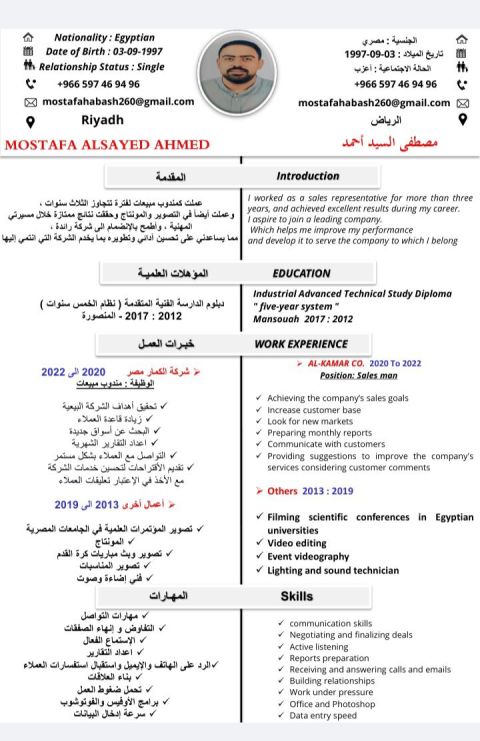 مشرف مبيعات مصري خبرة 15 عاما بمجال مبيعات الأغذية خبرة 12 عاما بكبرى شركات المبيعات والتوزيع بالمملكة العربية السعودية قادر علي تحليل ودراسة السوق ووضع خطط مستقبليه وادارة العمليات البيعية