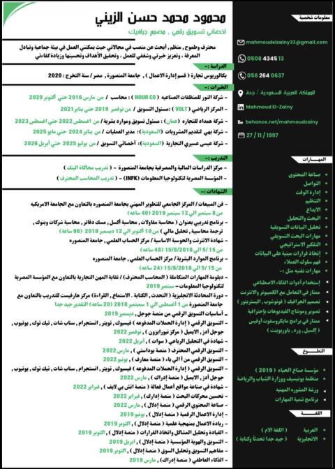 مدير تسويق الكتروني ومخرج اعلانات مصري الجنسية (تصوير - مونتاج - تصميم جرافيك - إدارة وانشاء حملات تسويقية - إدارة حسابات السوشيال ميديا) خبرة 7 سنوات في مجالات الميديا العمل جزئي فري لانس وليس دوام كامل أو عن بعد (التصوير في نطاق أبها وخميس مشيط)