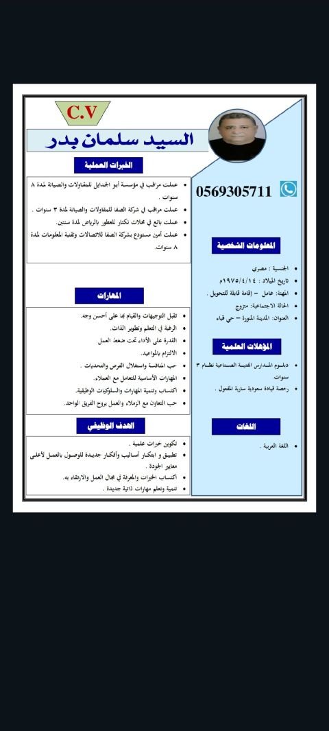 ابحث عن وظيفة دائمه وعمل في تطوير وبيئة عمل متطوره وأمان وظيفي وأشارك بتطوير المنشأة بخبرتي والعملية وجهدي وانضم لعائلة جديدة أثبت فيها قدراتي + يتوفر عندي سكن وسيارة ومواليد السعودية وأحمل وثيقة فلسطيني وثيقة مصرية ومعفى من رسوم مكتب العمل ومرفق لكم أل CV جميع الخبرات