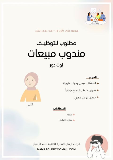 مطلوب مندوب مبيعات في مجمع طبي في الرياض حي نمار أنثى لا نشترط جنسية معينة لكن الأهم خبرة في المجال الطبي الرجاء ارسال السيرة على الايميل أو التواصل