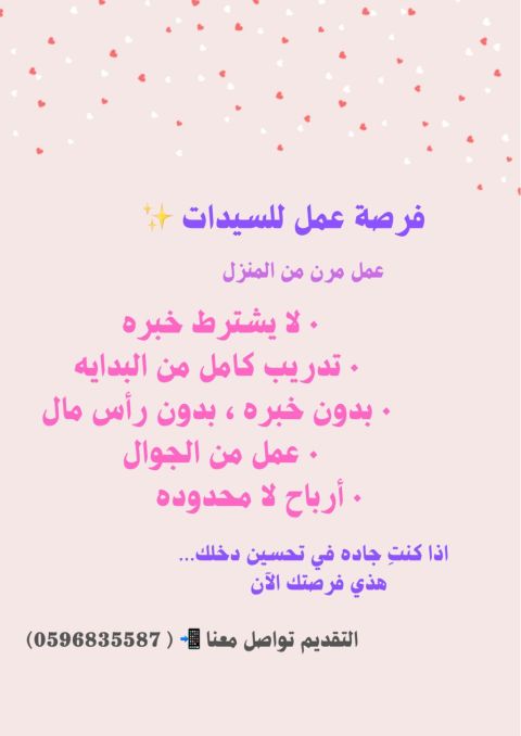 فرصة عمل عن بعد - تسويق وإدارة محتوى الرياض - حي الروضة نبحث عن سيدات جادات للعمل عن بعد في مجال التسويق الالكتروني وإدارة المحتوى. طبيعة العمل التسويق لمنتجات معروفة عبر وسائل التواصل الاجتماعي - التواصل مع العملاء وتقديم المعلومات - العمل من المنزل وبساعات مرنة الشروط الجدية والالتزام - الرغبة في التعلم وتطوير الذات - توفر هاتف ذكي واتصال انترنت - لا يشترط خبرة سابقة (يوجد تدريب ودعم) المميزات