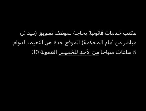 مكتب خدمات قانونية بحاجة لموظف تسويق (ميداني مباشر من أمام المحكمة) الموقع جدة حي النعيم، الدوام 5 ساعات صباحا من الأحد للخميس العمولة 30