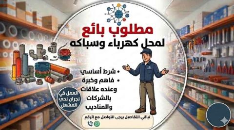 مطلوب بائع لمحل كهرباء وسباكة يشترط خبرة في نفس المجال ومعرفة بالمنتجات والشركات والمناديب. العمل في منطقة نجران حي المشعل