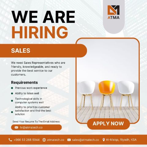 ATMA Company specialized in software development and system solutions is announcing new job opportunities We are expanding our team and currently looking for a full time Sales Representative Job Requirements Minimum of 2 years of experience Educational background open to all fields, with preference for accounting graduates Transferable Iqama residency Own a car and have a valid driving lic