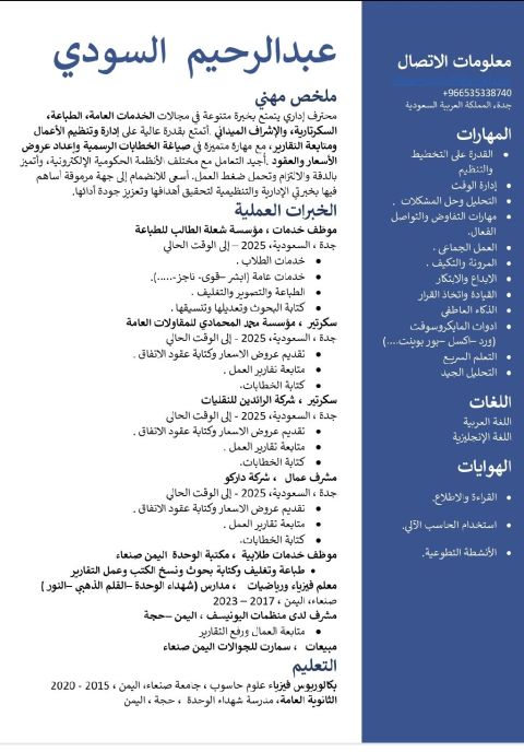 ابحث عن عمل أنا سكرتاري امتلك خبرة في إدارة المواعيد وتنظيم الملفات. اضافة الى مهارات عالية في التواصل وتنسيق الأعمال اليومية ودعم فرق الإدارة لتحقيق الكفاءة والانجاز. أتميز بالقدرة على التعامل مع ضغوط العمل وحسن التنظيم والدقة في تنفيذ المهام مع اتقان استخدام برامج مايكروسوفت أوفيس وإدارة الاجتماعات والمراسلات باحترافية. أطمح لأن أكون جزءا من مؤسستكم المرموقة، وأسهم في تطوير بيئة العمل وتحقيق أهدافها