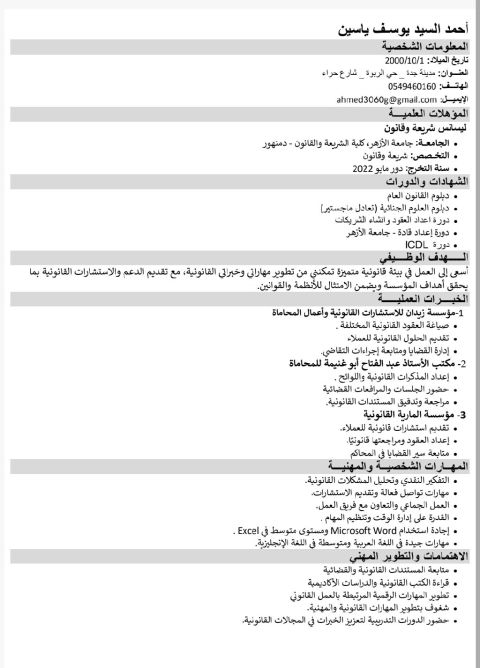 أنا أحمد السيد من مصر 25 سنة حاصل علي ليسانس قانون وماجستير في القانون العام والجنائي واقامتي سارية لمدة سنة وعندي خبرة جيدة في ادخال البيانات ورفع التقارير والفواتير واستخدام برامج الأوفيس وجيد جدا في اسكريل