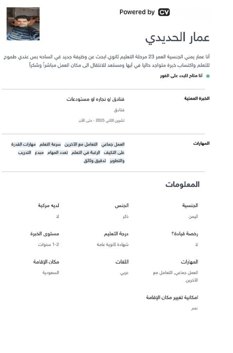 أنا عمار يمني الجنسية العمر 23 مرحلة التعليم ثانوي ابحث عن وظيفة في مجال الفنادق أو المصانع أو أي مجال قد عملت من قبل في مطاعم ومحل عصائر وعندي طموح للتعلم واكتساب خبرة متواجد حاليا في جدة ومستعد للانتقال الى مكان العمل مباشرة