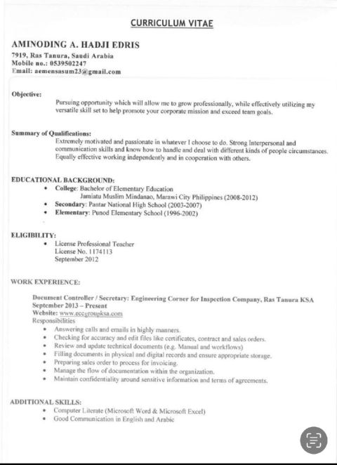 أمين الدين من الفلبين ابحث عن عمل سكرتير في الدمام أو الخبر خبرة بالمملكة عملت في شركة الركن الهندسي للفحص موجود حاليا في الفلبين ابحث عن فيزا