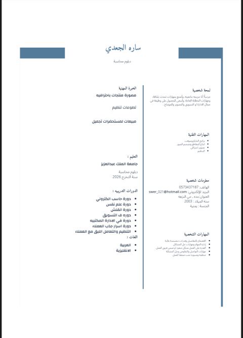 ساره الجعدي عمري 23 سنة يمنية مواليد السعودية بإقامة سارية المفعول ابحث عن وظيفة مكتبية سكرتيرة مدخلة بيانات كاشير كول سنتر استقبال مساعدة ادارية ولدي خبرات مكتسبة اطمح في تطويرها درست وتخرجت في جامعة الملك عبدالعزيز في جدة في تخصص المحاسبة