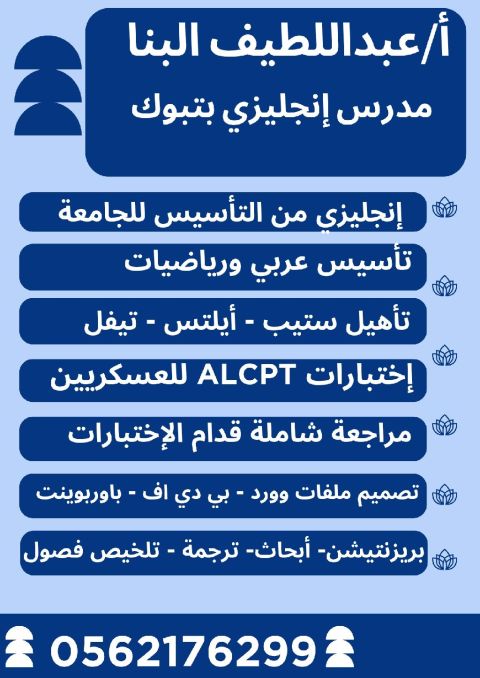 مدرس انجليزي في تبوك - من التأسيس للجامعة - تأسيس عربي ورياضيات. تأهيل ستيب وأيلتس وتيفل. التأهيل لاختبارات ALCPT للعسكريين. مراجعة شاملة قدام الاختبارات عمل بريزنتيشن وترجمة وعمل سي في. تصميم ملفات وورد وبي دي أف وبوربوينت