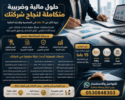 هل تبحث عن خبير مالي يساعد شركتك على تنظيم الإدارة المالية وحل المشكلات الضريبية بكفاءة واحتراف أقدم خدمات الاستشارات المالية والضريبية المتكاملة للشركات، وتشمل تقييم موظفي الإدارة المالية اعداد وتجهيز الاقرارات الضريبية حل مشكلات الفحص الضريبي اعداد القوائم المالية والتقارير الدورية اعداد الموازنات والتدفقات النقدية تأسيس وتطوير الأنظمة المحاسبية للشركات مراجعة الرقابة الداخلية والدورة المستندية