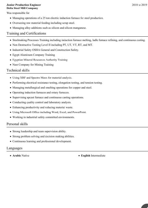 Production & Metal Melting Engineer - 9 Years of Experience Production Engineer specialized in the metals industry, with over 9 years of hands - on experience in operating and managing production lines and metal melting processes using Induction Furnaces. Experienced in billet steel plants, electrical cable manufacturing, and copper products. Strong background in charge calculations, quality improve