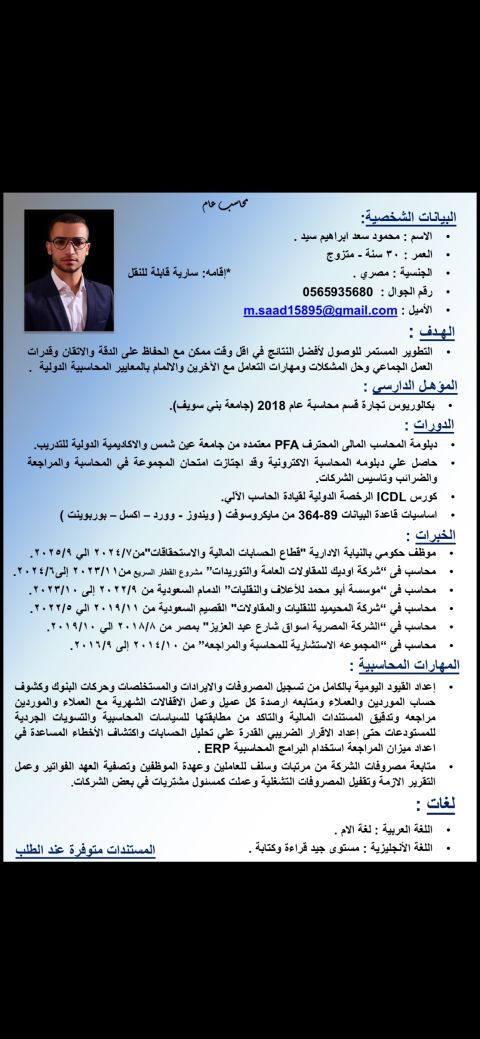 محاسب مالي عملت في عدد من المصانع عملت علي عدد من برامج الحسابات الماليه مقيم في الرياض مستعد للعمل في أي مدينة بالمملكة مهنة في الإقامة محاسب حاصل علي عضوية هيئة المحاسبين السعودية