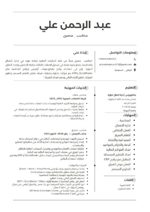 محاسب سوداني أتمتع بخبرة عملية تزيد عن خمس سنوات داخل المملكة العربية السعودية، عملت خلالها في قطاع المطاعم والشركات. لدي خبرة متميزة في اعداد القوائم المالية والتقارير المحاسبية، ومعالجة ضريبة القيمة المضافة، وإدارة الحسابات البنكية، بالاضافة الى الاشراف على عمليات المشتريات وتنظيمها بكفاءة عالية. كما امتلك مهارات قوية في التعامل مع العديد من الأنظمة والبرامج الحكومية مثل قوى، مقيم، تم
