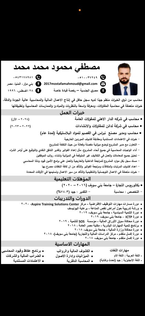 زياد الماوردي مصري الجنسية خريج بكالوريوس محاسبة ابحث عن فرصة عمل في مجال المبيعات خبرة لمدة 7 سنوات في السوق المصري والسعودي