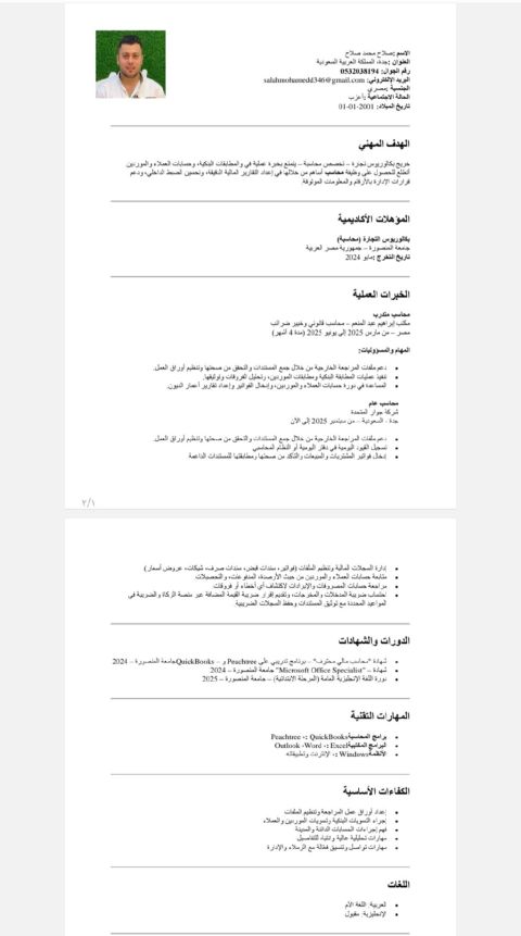 محاسب مصري ابحث عن وظيفة في بيئة عمل احترافية أستطيع من خلالها تطوير مهاراتي والمساهمة في نجاح الشركة. حاصل على بكالوريوس تجارة - محاسبة (جامعة بني سويف - 2023) ولدي خبرة سنتين في العمل المحاسبي والمبيعات، بالاضافة الى دورات في Excel المحاسبي والمحاسب المحترف. أجيد استخدام برامج Microsoft Office ولدي مهارات في تحليل الحسابات والدقة في ادخال البيانات والعمل تحت الضغط. للتواصل أحمد عايد أحمد عب