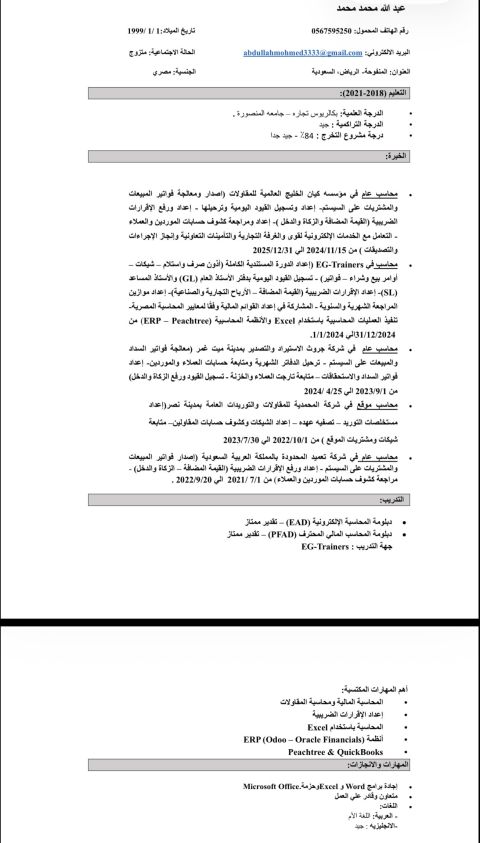 محاسب ذو خبرة 4 سنوات العمر 27 عام داخل خميس مشيط ومتاح على للعمل، ابحث عن فرصة عمل مناسبة في مجال المحاسبة حاصل علي بكالوريوس تجارة قسم محاسبه. الخبرات اجادة اعداد القيود اليومية والتقارير المالية وتسوية العهد واعداد مسير الرواتب وعمل أوامر صرف المشتريات ومتابعة حسابات الموردين. والتعامل مع البرامج المحاسبية ERP مثل أودو والمدقق وألفا وكريستال للحسابات. متاح لنقل الكفالة