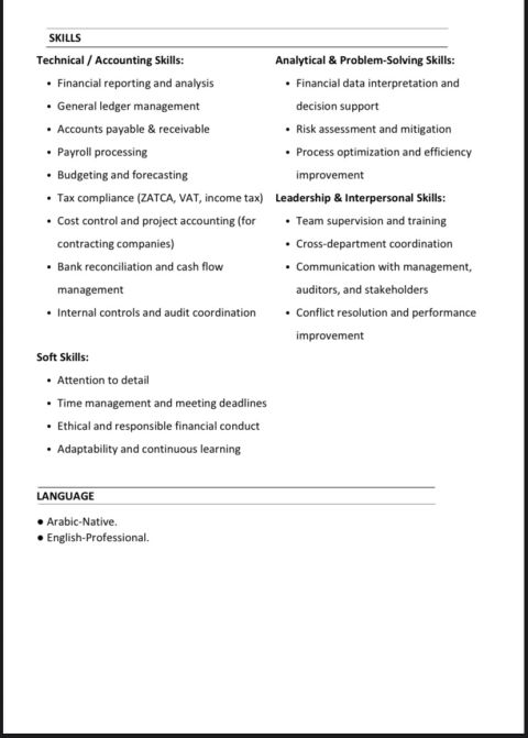 أنا محاسب مالي أتمتع بقدر كافي من المهارات كفء في عملي وأداء المهام التي توكل الى والعمل بروح الجماعة والفردية ومفارس للبرامج المحاسبية والأوفيس والسرعة في التطوير وتجويد العمل، الجوال الجنسية. سوداني القيام بالمهام التالية متابعه وضبط حسابات العملاء والخزينة، اعداد التنسويات للحسابات البنوك اعداد الاقرارا الضربية. اعداد القوائم المالية، وأنا اعمل حاليا على تطوير نفسي، أحمل تأشيرة زيارة