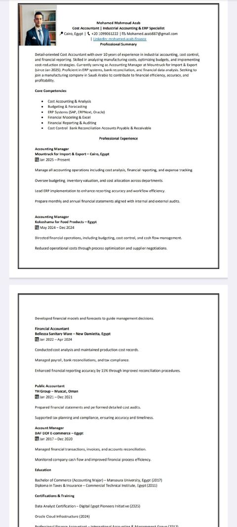 Egyptian accountant with 15 years of experience. Senior accountant, customer, supplier and collection accounts, warehouse accounts, general accounts. Experience in architecture and contracting companies, transportation companies, and agricultural companies, located in Riyadh