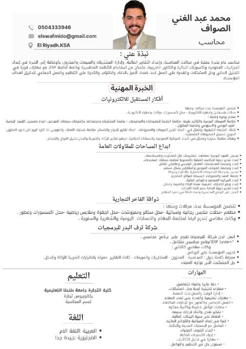 محاسب يمني حديث التخرج (العمر 28 سنة) مقيم في المملكة العربية السعودية - مكة المكرمة، ابحث عن فرصة عمل في مجال المحاسبة لدى جهة تسعى للتميز والتطوير. امتلك الحماس والدافعية لبناء مسيرة مهنية ناجحة، وأسعى لأن أكون عنصرا فاعلا وذو منفعة حقيقية للمؤسسة من خلال الالتزام، الدقة، والتعلم المستمر. أطمح للمساهمة في تعزيز الكفاءة المالية وتحقيق الأهداف التشغيلية والمالية للمؤسسة مستعد للعمل في أي مكان