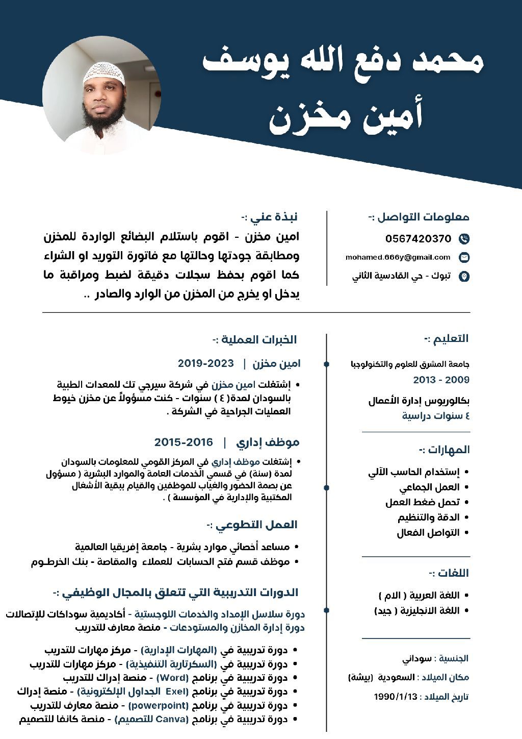 أنا محمد دفع الله سوداني الجنسية موظف مخزن أقوم باستلام البضائع الواردة للمخزن ومطابقة جودتها وحالتها مع فاتورة التوريد أو الشراء كما أقوم بحفظ سجلات دقيقة لضبط ومراقبة ما يدخل أو يخرج من المخزن من الوارد والصادر اشتغلت 4 سنوات في شركة سيرجي تك للمعدات الطبية في السودان وكنت مسؤول عن مخزن خيوط العمليات الجراحية في الشركة