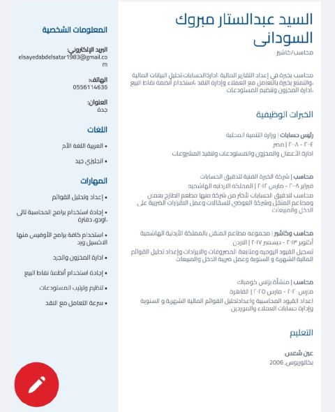 مدير مالي واداري ورئيس حسابات خبرة أكثر من عشرة سنوات في السعودية والسودان ضمن قطاعات متعددة تشمل التجارة والعاملات منزليات والقطاع المصرفي خبرة في اعداد القوائم المالية والتقارير وحساب التكاليف المصانع والتحليل المالي وثقيل التكاليف وتقليل المصروفات خبرة كافية في البرامج المحاسبية والمنصات الحكومية السعودية