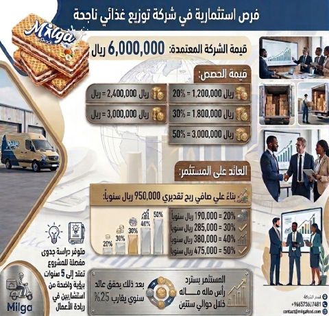 مطلوب ممول نقدم لك فرصة استثمارية واعدة البراند سريع النمو في عالم السندويشات (مع عجينة سرية) وطريقة تقديم مميزة، سنعمل على جذب جمهور محلي (نمو متوقع 30%) سنويا (عائد استثمار قوي) فريق اداري محترف) خطة توسع تشمل افتتاح 5 افرع خلال سنتين ندرك أهمية الشراكة مع رواد الأعمال ذوي الرؤية، ونتطلع لفرصة التعاون لدعم وتحقيق النجاح المتبادل. لمزيد من التفاصيل، نرحب بترتيب اجتماع