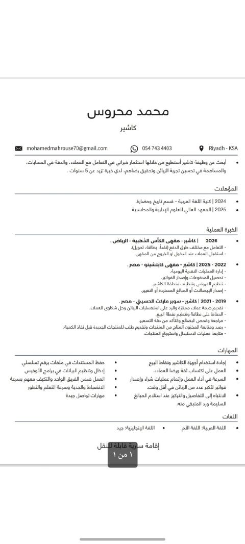 ابحث عن فرصة عمل كاشير لدي خبرة كبيرة في العمل