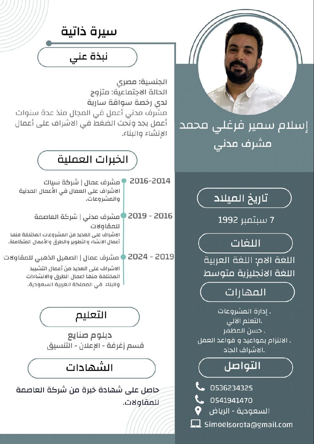 مصري مقيم بالمملكة العربية السعودية عندي خبرة في مجال المقاولات مشرف عمال وصيانة الطرق