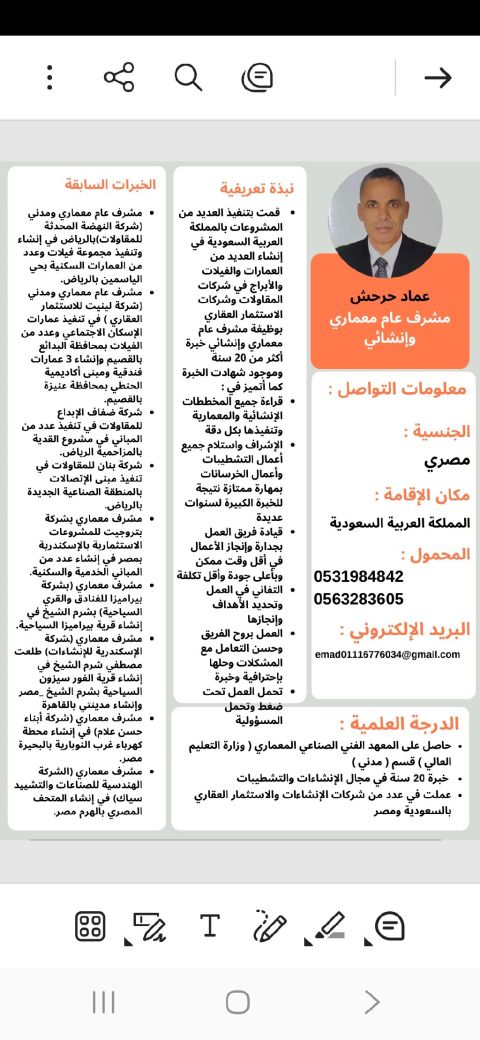 مشرف عام معماري وانشائي مصري خبرة 20 سنة في التنفيذ والاشراف واستلام جميع أعمال التشطيبات والعظم وقراءة المخططات المعمارية والانشائية وتنفيذها بأعلى جودة وأسرع وقت وأقل تكلفة وضبط سير العمل باحترافية وحساب الكميات والتكاليف والعمل على ميزان الليفل المساحي وذلك في الأبراج والفلل والعمارات والمصالح الحكوميه والمباني الصناعية بداية من الحفر حتى التسليم على المفتاح