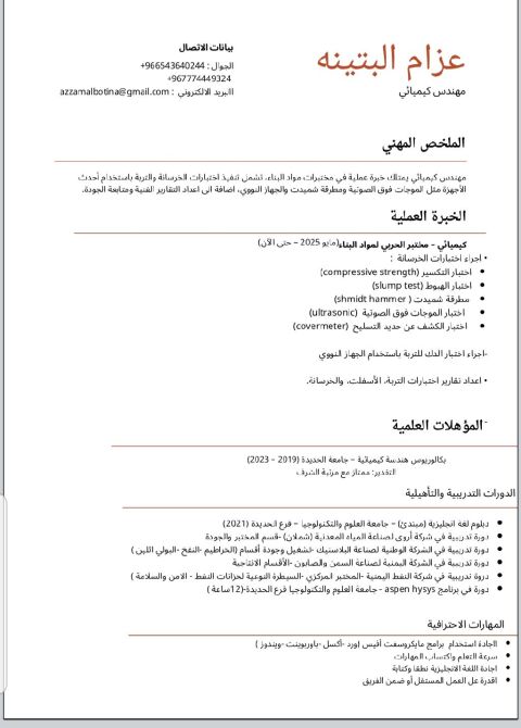 كيميائي خبرة في اختبارات الخرسانة والتربة، أجيد استخدام اجهزة الفحص الحديثة واعداد التقارير بدقة، وابحث عن فرصة عمل كفني مختبر خرسانة