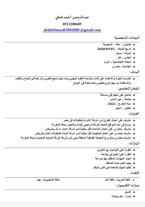 عبدالرحمن أحمد فتحي مشرف معماري خبرة في التشطيب يوجد رخصة قيادة سعودية سارية وإقامة سارية السن 26