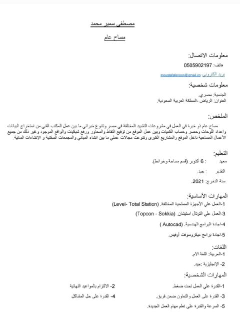 مساح عام خبرة 4 سنوات في أعمال الموقع والمكتب الفني سبق العمل في الأحياء السكنيه والأعمال الانشائية والتشطيبات وأعمال البنية التحتية وأعمال اللاند سكيب وأعمال الطرق وأعمال المنشاءات المعدنية واجادة أعمال المكتب الفني والحصورات واستخدام البرامج الهندسيه (AutoCAD & civil) وايجادة برامج الأوفيس (excel - word) والعمل علي اجهزة المساحة بأنواعها (total station & level)