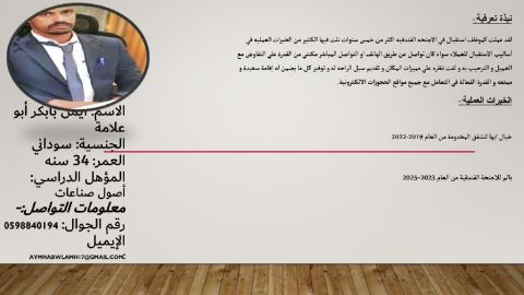 ابحث عن عمل في أي مجال عندي خبرات متكاملة في البقايل أو محل رحلات أو أي مجال عمل أنا مستعد وعندي دبلوم حاسوب ومستوى جيد في اللغة الانجليزية نشيط في العمل وأنا حق عمل. وعندي خبرة في مجال المبيعات والتسويق وحسن التعامل مع العملاء إقامة سارية المفعول المهنة عامل عادي الجنسية يمني