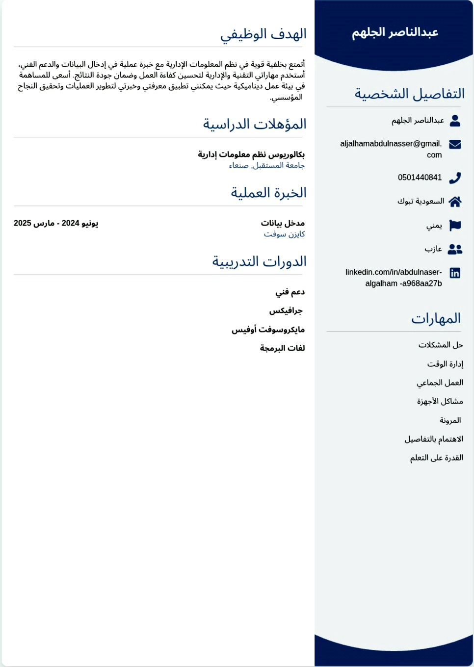 الجنسية يمني. العمر 23. حاصل على بكالوريوس نظم المعلومات الادارية. لدي خبرة في ادخال البيانات، وإدارة الأنظمة، وتطبيقات مايكروسوفت أوفيس ولدي خبرة في الدعم الفني وخدمة عملاء. كما أتمتع بمهارات تواصل ممتازة مع العملاء