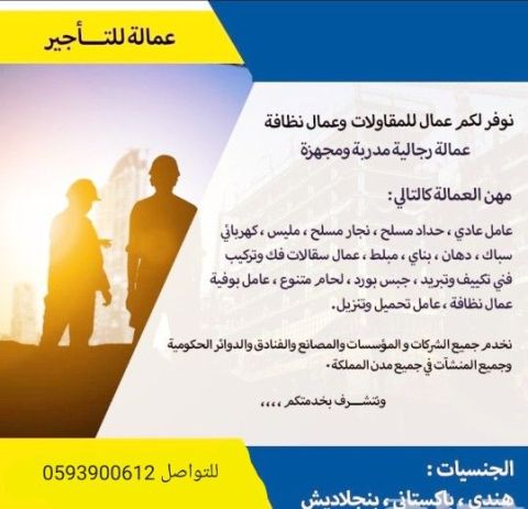موجود عمال نقل كفالة أو تعاقد أجير أو بدون أجير، للمشاريع أو المصانع أو المصانع أو الشركات أو المطاعم أو المقاهي أو الأسواق التجاريه أو للمقاولات وغيرها كافة المهن (نظافة. تحميل تنزيل. عمال مقاولات. فنيين مقاولات. الخ