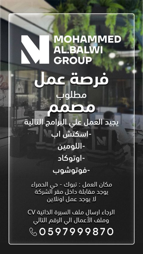 فرصة عمل مطلوب مصمم يجيد العمل على البرامج التالية اسكتش أب اللومين اوتوكاد فوتوشوب مكان العمل داخل مدينة تبوك - حي الحمراء يوجد مقابلة داخل مقر الشركة الرجاء إرسال السيرة الذاتية
