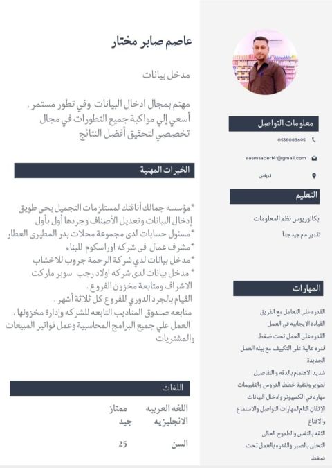 عاصم صابر مختار إبراهيم 25 سنة - مصري - بكالوريوس نظم المعلومات الاداريه خبرة في ادخال البيانات والكاشير وموظف استقبال ومشرف عمال وخبرة في المبيعات والتسويق