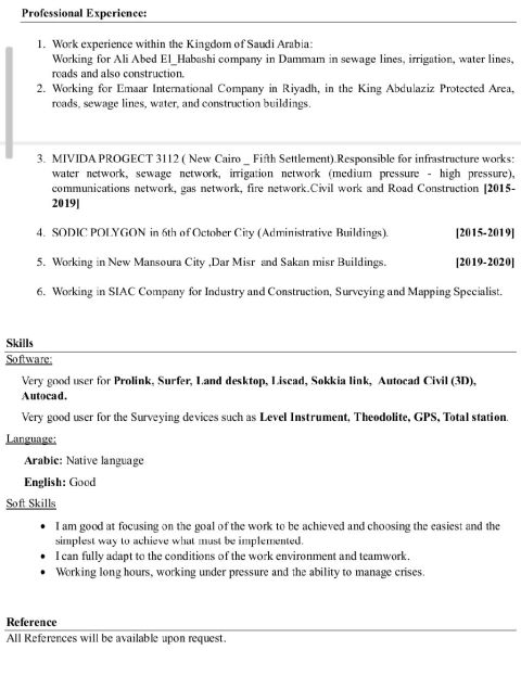 أنا أخصائي مساحة وخرائط أجيد العمل على جهاز أل gps والتوتال استيشن وميزان القامة وملم بالبرامج المساحية الاوتوكاد والاكسل وغيرها خبرة 10 سنوات خبرة داخل المملكة 3 سنوات عملت بمشاريع انشائية وخطوت صرف صحي ومياه وكابلات كهرباء وفاير وري وأيضا لدى خبرة بالطرق العامة وخبرة بالمحميات كمحمية الملك عبد العزيز الملكية وأجيد عمل وطباعة أوراق الاستشاري كالركوستات والداتا وتسليم الاستشاري بدقة عالية في الرياض