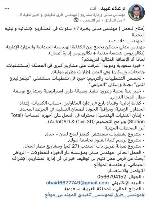 متاح للعمل ك مهندس مدني بخبرة 7 + سنوات في المشاريع الانشائية والبنية التحتية مهندس مدني متمكن يجمع بين الكفاءة الهندسية الميدانية والمهارة الادارية (بكالوريوس هندسة مدنية + بكالوريوس إدارة أعمال) خبرة سعودية ودولية أشرفت على مشاريع كبرى في المملكة (مستشفيات، جامعات، واسكان) وفي اليمن (طارات وطرق دولية)