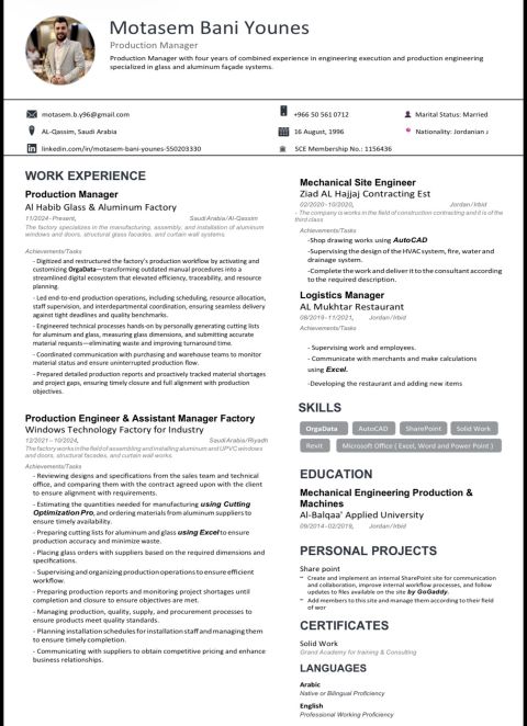 مهندس ميكانيكا حاصل على عضوية الهيئة السعودية للمهندسين، امتلك خبرة تمتد لأكثر من 8 سنوات في مجال المقاولات، شملت تنفيذ وإدارة مشاريع البنية التحتية والمشاريع السكنية. شاركت في مشاريع تابعة لوزارة الاسكان، شركة روشن، اضافة الى مشاريع للقطاع الخاص. أتمتع بخبرة قوية في الاشراف الموقعي وضبط الجودة، ومتابعة الأعمال وفق المخططات والمواصفات الفنية، مع الالتزام بمعايير السلامة والجودة