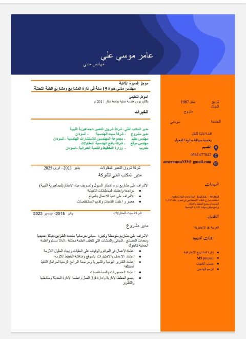 مهندس مدني خبرة 9 سنوات ابحث بشكل جاد عن فرصة عمل مناسبة في مجال إدارة المشاريع أو الاشراف. خبرة قوية في مشاريع المياه والصرف الصحي والبنية التحتية، والعمل مع شركات حكومية كبرى. اشتغلت منصب مدير مشروع بمشاريع شركة المياه الوطنية، ولدي قدرة عالية على المتابعة والتنظيم والالتزام. متاح للعمل فورا