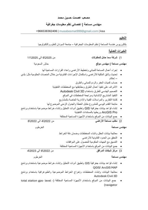 مهندس مساحة أخصائي نظم معلومات جغرافية سوداني الجنسية خبرة 4 سنوات في جميع أعمال المساحة واجهزة المساحة والبرامج المساحية وحساب الكميات متواجد داخل المملكة العربية السعودية وأحمل رخصة قيادة جاهز للعمل الفوري